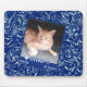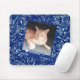 Customisable framed photo of cat or dog and its name and something extra, date... over blue background that simulates the curves of the textured wall.
