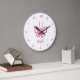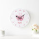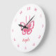Girly butterfly pattern clock with customisable name at bottom in pink lettering. Pink clock face numbers, with some numbers replaced by pink butterfly designs. On white background, which may be changed to any colour. Cute gift for little girls.