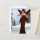 Holiday winter fairy in a brilliant red gown enjoying the snow.