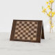 This customisable greeting card design features a rich dark wood veneer with an inlaid eight by eight square chequered board of alternating decorated brown and cream tiles representing the dark and light squares of a chessboard, draughts board or checkers board.