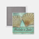 Two sea shells against a blue green background with easy to customise bride and groom's name. Perfect design for destination weddings, Hawaii, Tahita, Bahamas and more.