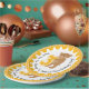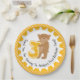 Brown Bear 3rd Birthday party paper plates features a cute brown teddy bear holding a big gold polka dotted number 3 on a white circle with a border of gold polka dots! You can easily add a thank you message or other text to customise these cute bear birthday paper plates!