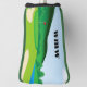Customise this golf blade putter cover with your initials to make it your own. A brightly coloured golf club landscape fills the background and makes this cover stand out in your golf bag.