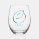 The artwork features the alphabet letter "O" in an artful script font of a colourful abstract design - extracted from a photo of spring plants captured using a special camera technique, along with customisable typography for name or other personalisation in blue font. Personalise this monogrammed stemless wine glass by adding the name or words of your choice to best suit your purpose or event!