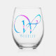 The artwork features the alphabet letter "W" in an artful script font of a colourful abstract design - extracted from a photo of spring plants captured using a special camera technique, along with customisable typography for name or other personalisation in blue font. Personalise this monogrammed stemless wine glass by adding the name or words of your choice to best suit your purpose or event!