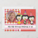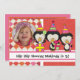 Adorable penguins with balloons, gifts, and party hats on a colourful invitation of red, orange, hot pink, and white with areas you can customise with your child's photo and birthday party specifics on penguin theme birthday invitations she's sure to love!