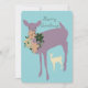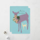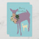 Christmas card with design of deer and poinsettia wreath. The words on its back are customizable.