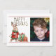 Happy Holidays One Photo Christmas Card featuring an adorable Christmas rabbit dressed in red and green with wrapped gifts.