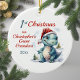 Celebrate the birth of a new great grandchild's first Christmas with this cute baby dinosaur holiday ornament which features a cartoon blue dinosaur wearing a red christmas Santa hat , The background features snow, snowflakes and fir trees. Personalise this magical ornament by amending the baby's name and year of birth. Can also be customised by changing Great grandma to Grandparents, Nana, Nan Granny or Great Grandpa granddad. . 1st Christmas can also be amended if you wish to have 2nd or 3rd Christmas or anything else to make this an extra special xmas tree decoration. Great to give as a gift to great grandparents or to buy as a keepsake.