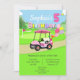 Celebrate a special little girl's fifth birthday with this charming golf-themed invitation! Featuring an adorable pink polka dot golf cart parked beside a putting green this sweet design is loaded with playful details a festive birthday cake, and a bunch of bright helium balloons, including a big number 1 balloon. Perfect for a golf-loving family or a unique fifth birthday theme, this invitation sets the tone for a fun-filled day on and off the green.