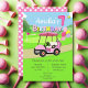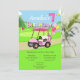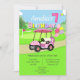 Celebrate a special little girl's seventh birthday with this charming golf-themed invitation! Featuring an adorable pink polka dot golf cart parked beside a putting green this sweet design is loaded with playful details a festive birthday cake, and a bunch of bright helium balloons, including a big number 1 balloon. Perfect for a golf-loving family or a unique seventh birthday theme, this invitation sets the tone for a fun-filled day on and off the green.