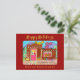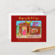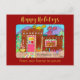 In this cute, whimsical design, three curious cats are sitting in the candy-cane framed window and on the perfectly-spiced roof of a tasty Taos style adobe gingerbread house in the American southwest. A candy cane cactus and multicolored gumdrops in candied citrus pots, as well as peppermint ceiling beams, frosted gingerbread pine trees, and other assorted goodies accent the house and yard, providing a welcome contrast to the desert sand. Purple mountains and greenery brighten the background beneath a cloudless bright blue winter sky. The design is set against a deep red background with the text "Happy Holidays from our home to yours" in gold. You can personalise this postcard by changing your name and the year on the sand in the lower right-hand corner of the design.