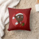 A pillow with an illustration of a cute smiling African American baby holding a Christmas present and wearing a Santa Claus hat; in a red circle on a red background, a Christmas holidays design