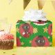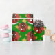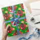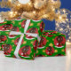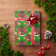 Christmas wrapping paper with an illustration of a cute smiling African American baby holding a Christmas present; in a red circle on a green background with stars, a Christmas holidays design with an editable text template for your name or message