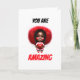 An adorable and cute hip African American girl with a red afro hair style and black braids is smiling broadly and is clutching a red heart to her chest. She is wearing a pink and white top, blue denim shorts and striped socks all set agaist a white background that has black and red bold text which reads "you are amazing". The inside is blank for your custom message. This versatile design is ideal for little girls wanting to express their feelings to their best friend or for adult woman wanting to convey to a lover, spouse or partner how much they care for them. Suited to both adults and kids. They are ideal for Valentine's Day holidays; a birthday, anniversary, engagement or as inspirational and motivational cards for a friend or work colleague that you are especially close to.