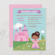 Plan a fairytale birthday party for the African American birthday girl with this princess theme birthday party invitation. This invitation has a cute African American princess who is wearing a pink and purple gown tied with a pink ribbon and a pink tiara on her tied up hair. A blue and yellow bird is near her feet. Background of beautiful grass patch, some with flowers, some with trees and a pink castle with purple roof. Personalise easily with your party details including the purple banner. Reverse page of pink polka dots pattern.