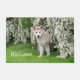 A young Alaskan Malamute puppy with a plush double coat standing in a grass meadow with a white flowering bush in spring. A cute dog photo taken by Katho Menden, this doormat is a gift idea for dog and pet lovers.