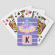 This Cute Deck of cards is sure to make your game funner. This design features a cute little purple octopus-like alien smiling in a pink UFO with Yellow flashing lights. There is a purple background with light purpler stripes that are bordered with blue. Under the alien is a pink square to put your monogram in.