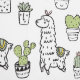 Image by Nadezda Barkova | Shutterstock. Image ID: 1143288728 | This doodle pattern features alpacas and cacti on a white background.