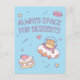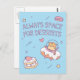 This postcard has a cute doodle with an otter in pink spacesuit out in space with a doughnut around it as a float while a strawberry cake and macaron floats in the background. The pun text reads "Always space for desserts". Perfect for someone who has room for dessert no matter how full they are!