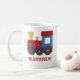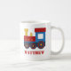 An adorable, attractive and toy train in the colours of yellow, red and blue train. Personalise easily with boy's name. A cute and colourful mug for boys and toddlers who love choo choo trains and lining up toy train tracks and rails.