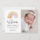Cute and colourful birth announcement featuring a watercolor rainbow in shades of yellow, pink, coral red, and blue. "Welcome" is displayed in a black handwritten script with your baby's name, birth stats, and custom message. Your baby's vertical photo is displayed on the right side of the announcement. The rainbow birth announcement reverses to display a matching rainbow pattern.