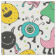 Cute kid friendly cartoon monster images make a colourful and fun pattern on this fabric. Images include purple monsters, black monsters with lots of legs, yellow montster with a big pink eye, green and blue monsters. . Colours include yellow, pink, black, green, teal on dotted background.