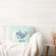 This personalised kids' throw pillow features a cute whimsical whale in a vibrant pink and blue colour scheme swimming playfully with a tiny hat.
