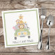 Cute gender-neutral baby shower napkin featuring a watercolor illustration of baby animals (lion, zebra, elephant, monkey and giraffe) piled into a safari vehicle. Personalise with the mother-to-be's name.
