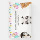This is a cute illustration featuring a penguin, panda, puppy, and colourful balloons
