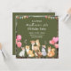 Cute animals with balloons, flowers, and birthday garlands on a green background. The balloons are pink in the shape of a heart