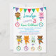 A whimsical childs birthday invitation with cute animals riding unicycles in including a bear, monkey, pig, cat, dog and rabbit. It features bright vibrant colours of blue, turquoise, red, aqua, yellow and purple carnival fun. This cute animals invitation is perfect for boy and girl first birthday 1st 2nd 3rd 4th 5th 6th birthdays. Whether hunting for bicycle or unicycle invites, this adorable birthday party invitation will bring a smile.