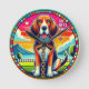 Adorable cartoon-style illustration of a dog with bright eyes, wearing a collar and chain, set against a coloured circular background.