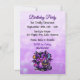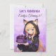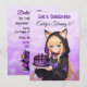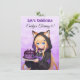 Cute birthday invitations for a girl's birthday party. A sweet anime girl in a fox ears hoodie holding a purple and black birthday cake. On the back is a cute anime dragon and your birthday party details.