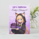 Cute birthday invitations for a girl's birthday party. A sweet anime girl in a fox ears hoodie holding a purple and black birthday cake. On the back is a cute anime dragon and your birthday party details.