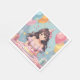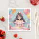 Pretty anime girl with birthday cake and balloons themed birthday party napkins. Pink, yellow and blue background.