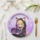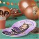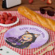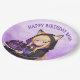 Cute personalized birthday paper plates for a girl's birthday party. A sweet anime girl in a fox ears hoodie holding a purple and black birthday cake.