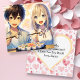 Adorable anime couple eating sushi together surrounded by cute watercolor hearts. Personalised Valentine's Day card full of sushi puns like "wasabi my valentine and I love you soy much."