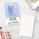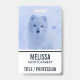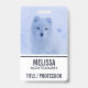 Name badge with a photograph of a white arctic fox. A wintery snowy landscape surrounds this delightful creature.