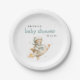 These cute baby shower paper plates feature a watercolor teddy bear dressed as an astronaut, riding on a rocket ship, below the words "baby shower" in blue-green hand printing. Personalize the text with the name of the mom-to-be and date in charcoal gray sans serif font.