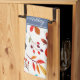 White kitchen towel with a cute autmn botanical leaves pumpkin pattern design and personalized name print in the center on a blue ribbon stripe.