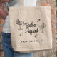 Cute tote bags for your bachelorette party favours featuring illustrations of glam party girls sunbathing in cocktail martini glasses, retro sparkle stars, "Babe Squad" in a retro script and the party location in simple modern typography.