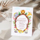 the front design shows a wooden frame with lots of baby animals and leaves attached to it and a written baby shower invitation in maroon in the middle. this design is extremely cute and will be perfect for your baby shower.