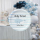 Light blue and white watercolor striped background, celebrating a baby boy themed shower. Cute, light blue whale with white seashell in the background just below "baby shower" text. Honoree name template created just for you!