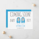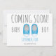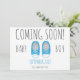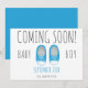 A cute and adorable baby boy shoes coming soon script blue pregnancy announcement with whimsical illustration.
