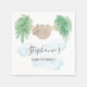This fun baby shower paper napkin features a sweet baby sloth hanging from a branch, with green watercolor jungle leaves and turquoise clouds.