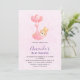 Baby Shower invitation with an adorable illustration of a little brown baby bunny wearing a tiny golden crown. Carried by balloons in a pink heart blanket.