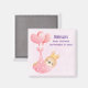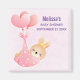 A save the date magnet with an adorable illustration of a little brown baby bunny wearing a tiny golden crown. Carried by balloons in a pink heart blanket.