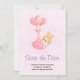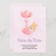 Save the date card with an adorable illustration of a little brown baby bunny wearing a tiny golden crown. Carried by balloons in a pink heart blanket.