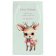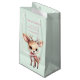 Gift bag with an illustration of an adorable baby deer. Big eyes big ears with a large head and little brown antlers. Wearing a big red bow.